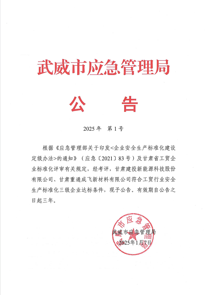 近日,甘肅建投新能源公司順利通過武威市應急管理局安全專家評審組驗收,被評為安全生產(chǎn)標準化三級企業(yè)。
