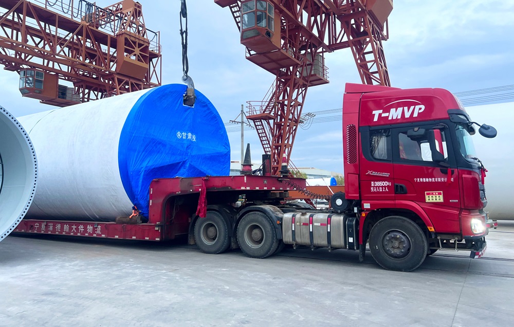金風(fēng)科技甘肅張掖臨澤30萬千瓦風(fēng)電項(xiàng)目塔筒裝車