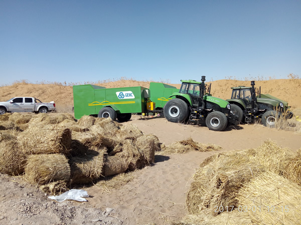 東方欲曉,曙光乍現(xiàn)。每一天當(dāng)魚肚白淺與淺藍(lán)交匯之際,睡在帳篷里的我們在發(fā)電機的隆隆聲中睜開惺忪的睡眼,簡單地吃過早飯,開始一天的工作。清晨的沙漠雖然有太陽散射的萬丈光芒,但襲人的瑟瑟寒氣讓我們直打哆嗦,為了方便作業(yè)、提高效率,我們輕裝上陣。往固沙機車廂里裝接草簾子是工作的開始,這一環(huán)節(jié)是最基礎(chǔ)的一步,也是最關(guān)鍵的一步,當(dāng)然也是最臟最累的工序。之所以說是最關(guān)鍵的一步是因為車廂內(nèi)的草簾子是由每一卷長12米左右的草簾子首尾相連依次串聯(lián)起來的,盡可能地不能出現(xiàn)接錯的情況,一旦出現(xiàn)就會直接影響固沙機壓草方格的效率,因此我們在穩(wěn)中求快,以提高整體的工作效率。