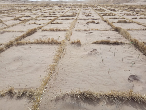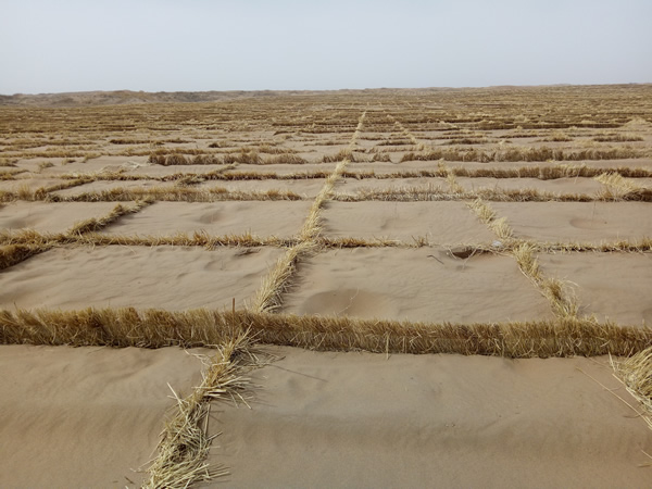 草簾子里的塵土大、沙粒多、碎草屑多,連續(xù)作業(yè)大半天,整個人全被塵埃和草屑所包裹,尤其是鼻孔里和耳朵里,滿滿的灰塵,縱然有口罩、帽子的庇護,還是如此。用細(xì)扎絲連接草簾子,每一天數(shù)百捆的草簾子和扎絲需要經(jīng)過雙手,手套不知磨破了多少雙,手指頭的皮膚皸裂了,長滿倒刺,剝了一層又一層,又干又脹。遇到大風(fēng),眼睛被沙粒和草屑吹迷,不過好在公司為我們及時配備了防護鏡,戴上之后有了極大的改善。條件雖然艱苦,工作雖然苦累,可是每每看著一塊塊麥草方格屹立在沙漠中,阻擋著風(fēng)沙的肆意蔓延時,大伙的臉上便會露出些許欣慰的笑容。
