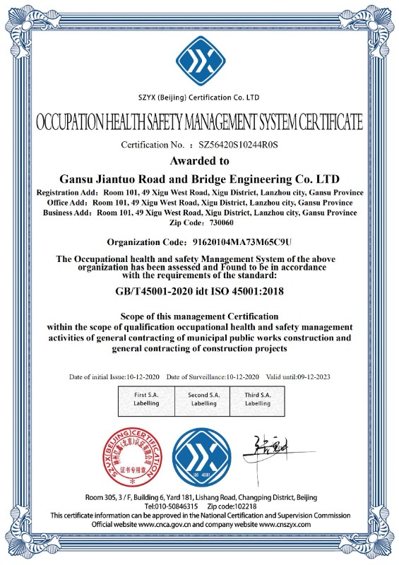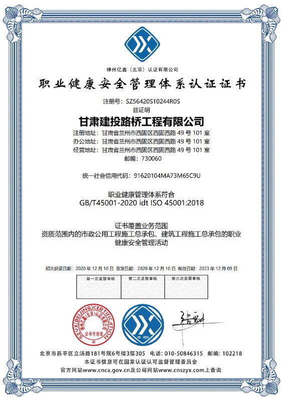 職業(yè)健康安全管理體系認(rèn)證證書